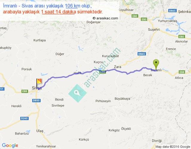 İmranlı - Sivas arası yaklaşık olarak 90 km/h ile yukarıda belirtilen sürede olup, iki yerin kuş uçuşu uzaklığı (mesafesi) 94'dir. Yolculuk otobüsle 1 saat 36 dakika sürmektedir.