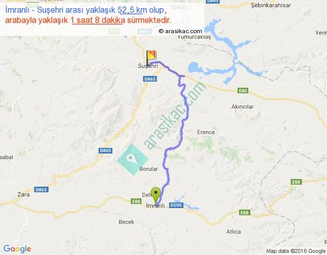 İmranlı - Suşehri arası yaklaşık olarak 90 km/h ile yukarıda belirtilen sürede olup, iki yerin kuş uçuşu uzaklığı (mesafesi) 32'dir. Yolculuk otobüsle 1 saat 28 dakika sürmektedir.