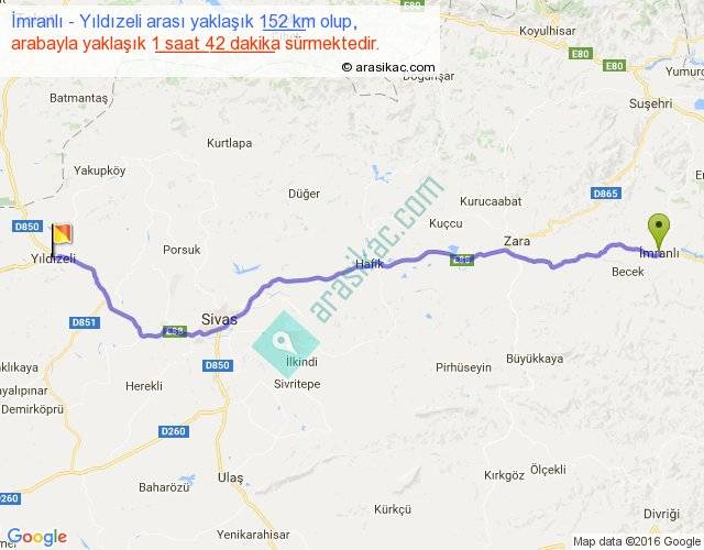 İmranlı - Yıldızeli arası yaklaşık olarak 90 km/h ile yukarıda belirtilen sürede olup, iki yerin kuş uçuşu uzaklığı (mesafesi) 128'dir. Yolculuk otobüsle 2 saat 12 dakika sürmektedir.
