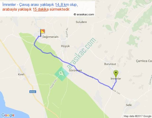 İmrenler - Çavuş arası yaklaşık olarak 90 km/h ile yukarıda belirtilen sürede olup, iki yerin kuş uçuşu uzaklığı (mesafesi) 11'dir. Yolculuk otobüsle 19 dakika sürmektedir.