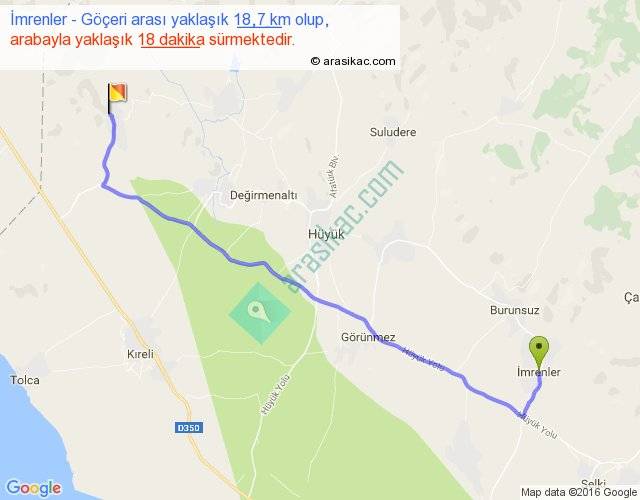 İmrenler - Göçeri arası yaklaşık olarak 90 km/h ile yukarıda belirtilen sürede olup, iki yerin kuş uçuşu uzaklığı (mesafesi) 15'dir. Yolculuk otobüsle 23 dakika sürmektedir.