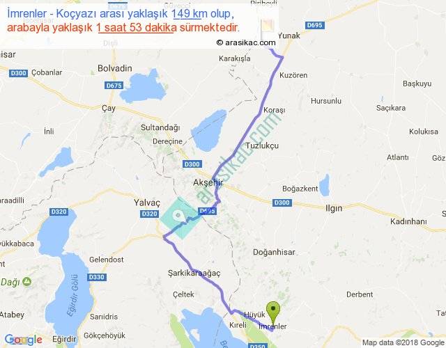 İmrenler - Koçyazı arası yaklaşık olarak 90 km/h ile yukarıda belirtilen sürede olup, iki yerin kuş uçuşu uzaklığı (mesafesi) 98'dir. Yolculuk otobüsle 2 saat 26 dakika sürmektedir.