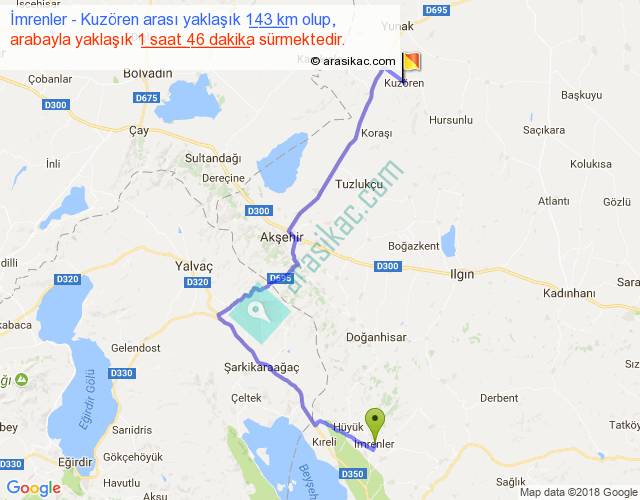 İmrenler - Kuzören arası yaklaşık olarak 90 km/h ile yukarıda belirtilen sürede olup, iki yerin kuş uçuşu uzaklığı (mesafesi) 86'dir. Yolculuk otobüsle 2 saat 17 dakika sürmektedir.
