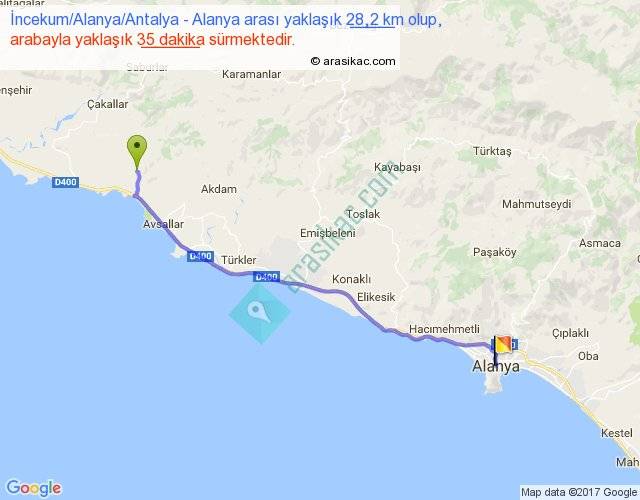 İncekum Alanya Antalya - Alanya arası yaklaşık olarak 90 km/h ile yukarıda belirtilen sürede olup, iki yerin kuş uçuşu uzaklığı (mesafesi) 25'dir. Yolculuk otobüsle 45 dakika sürmektedir.