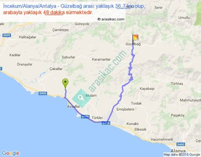İncekum Alanya Antalya - Güzelbağ arası yaklaşık olarak 90 km/h ile yukarıda belirtilen sürede olup, iki yerin kuş uçuşu uzaklığı (mesafesi) 16'dir. Yolculuk otobüsle 1 saat 2 dakika sürmektedir.