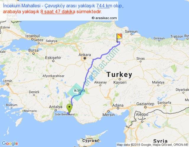 İncekum Mahallesi - Çavuşköy arası yaklaşık olarak 90 km/h ile yukarıda belirtilen sürede olup, iki yerin kuş uçuşu uzaklığı (mesafesi) 556'dir. Eğer belirtilen yerler arasında uçak seferi var ise bu süre uçakla 51 dakika'ya kadar düşebilir. Yolculuk otobüsle 11 saat 25 dakika sürmektedir.