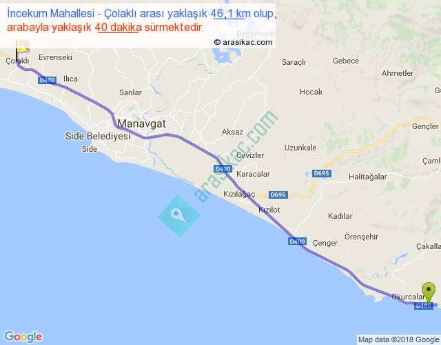 İncekum Mahallesi - Çolaklı arası yaklaşık olarak 90 km/h ile yukarıda belirtilen sürede olup, iki yerin kuş uçuşu uzaklığı (mesafesi) 42'dir. Yolculuk otobüsle 52 dakika sürmektedir.