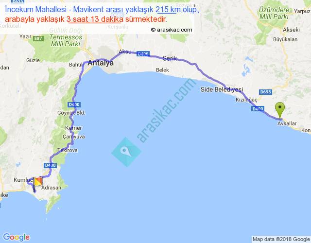 İncekum Mahallesi - Mavikent arası yaklaşık olarak 90 km/h ile yukarıda belirtilen sürede olup, iki yerin kuş uçuşu uzaklığı (mesafesi) 129'dir. Yolculuk otobüsle 4 saat 10 dakika sürmektedir.