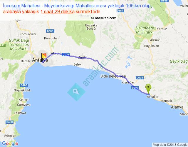 İncekum Mahallesi - Meydankavağı Mahallesi arası yaklaşık olarak 90 km/h ile yukarıda belirtilen sürede olup, iki yerin kuş uçuşu uzaklığı (mesafesi) 92'dir. Yolculuk otobüsle 1 saat 55 dakika sürmektedir.