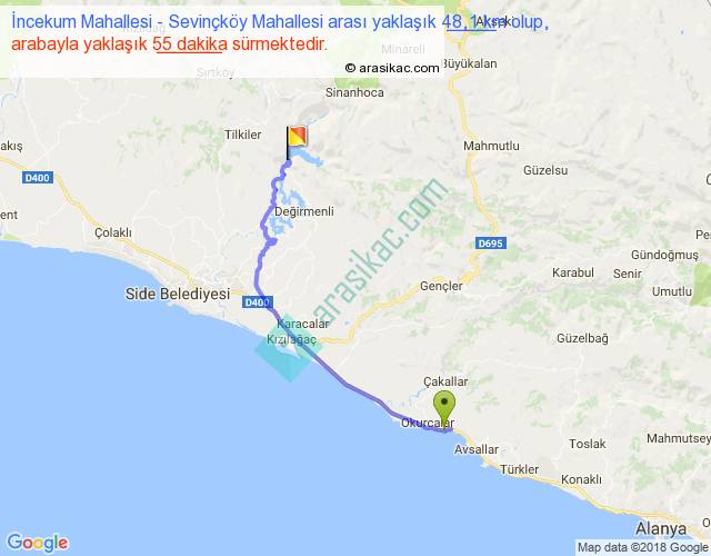 İncekum Mahallesi - Sevinçköy Mahallesi arası yaklaşık olarak 90 km/h ile yukarıda belirtilen sürede olup, iki yerin kuş uçuşu uzaklığı (mesafesi) 34'dir. Yolculuk otobüsle 1 saat 11 dakika sürmektedir.