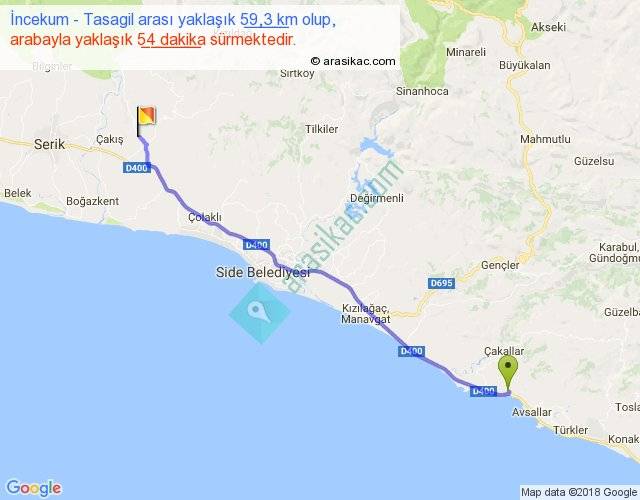 İncekum - Tasagil arası yaklaşık olarak 90 km/h ile yukarıda belirtilen sürede olup, iki yerin kuş uçuşu uzaklığı (mesafesi) 54'dir. Yolculuk otobüsle 1 saat 10 dakika sürmektedir.
