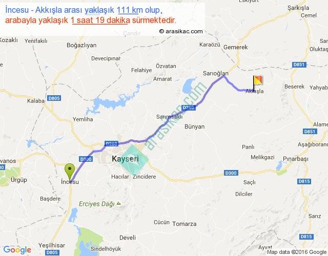 İncesu - Akkışla arası yaklaşık olarak 90 km/h ile yukarıda belirtilen sürede olup, iki yerin kuş uçuşu uzaklığı (mesafesi) 95'dir. Yolculuk otobüsle 1 saat 42 dakika sürmektedir.
