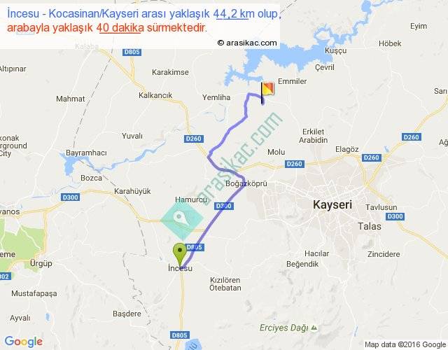 İncesu - Kocasinan Kayseri arası yaklaşık olarak 90 km/h ile yukarıda belirtilen sürede olup, iki yerin kuş uçuşu uzaklığı (mesafesi) 31'dir. Yolculuk otobüsle 52 dakika sürmektedir.