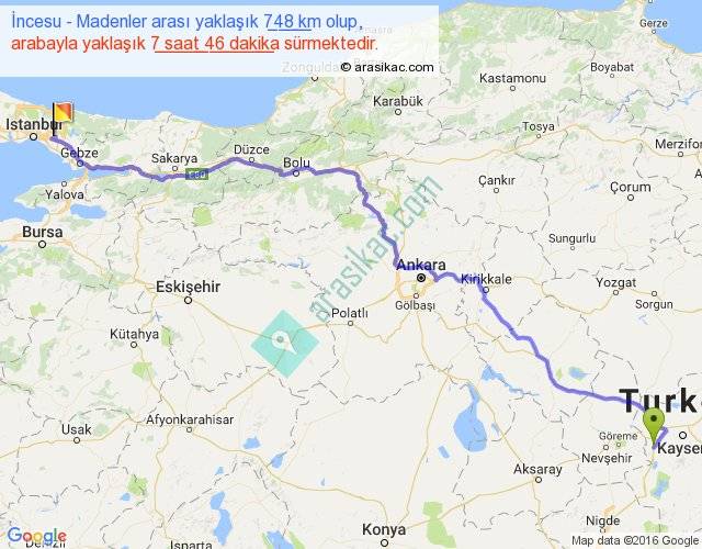 İncesu - Madenler arası yaklaşık olarak 90 km/h ile yukarıda belirtilen sürede olup, iki yerin kuş uçuşu uzaklığı (mesafesi) 573'dir. Eğer belirtilen yerler arasında uçak seferi var ise bu süre uçakla 52 dakika'ya kadar düşebilir. Yolculuk otobüsle 10 saat 5 dakika sürmektedir.