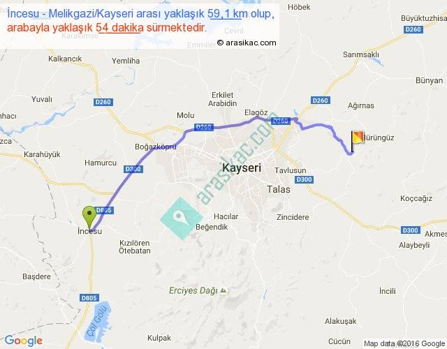 İncesu - Melikgazi Kayseri arası yaklaşık olarak 90 km/h ile yukarıda belirtilen sürede olup, iki yerin kuş uçuşu uzaklığı (mesafesi) 47'dir. Yolculuk otobüsle 1 saat 10 dakika sürmektedir.
