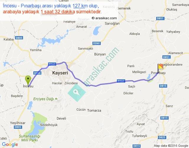 İncesu - Pınarbaşı arası yaklaşık olarak 90 km/h ile yukarıda belirtilen sürede olup, iki yerin kuş uçuşu uzaklığı (mesafesi) 105'dir. Yolculuk otobüsle 1 saat 59 dakika sürmektedir.