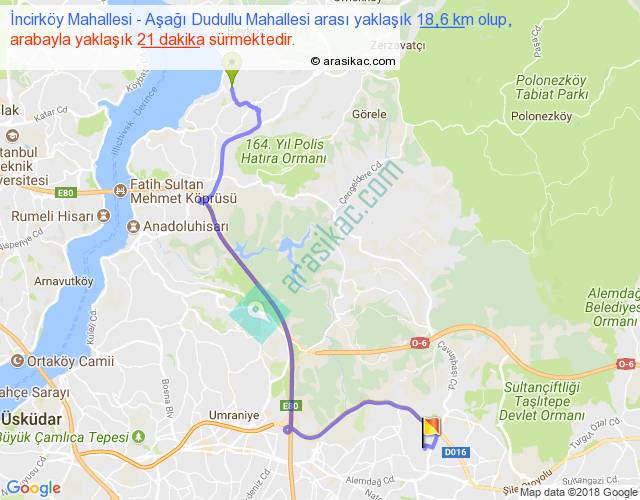İncirköy Mahallesi - Aşağı Dudullu Mahallesi arası yaklaşık olarak 90 km/h ile yukarıda belirtilen sürede olup, iki yerin kuş uçuşu uzaklığı (mesafesi) 12'dir. Yolculuk otobüsle 27 dakika sürmektedir.