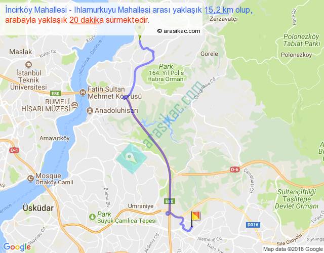 İncirköy Mahallesi - Ihlamurkuyu Mahallesi arası yaklaşık olarak 90 km/h ile yukarıda belirtilen sürede olup, iki yerin kuş uçuşu uzaklığı (mesafesi) 11'dir. Yolculuk otobüsle 26 dakika sürmektedir.