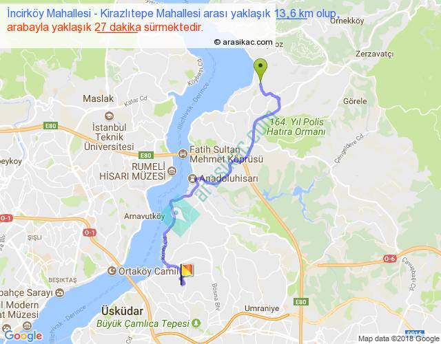İncirköy Mahallesi - Kirazlıtepe Mahallesi arası yaklaşık olarak 90 km/h ile yukarıda belirtilen sürede olup, iki yerin kuş uçuşu uzaklığı (mesafesi) 9'dir. Yolculuk otobüsle 35 dakika sürmektedir.