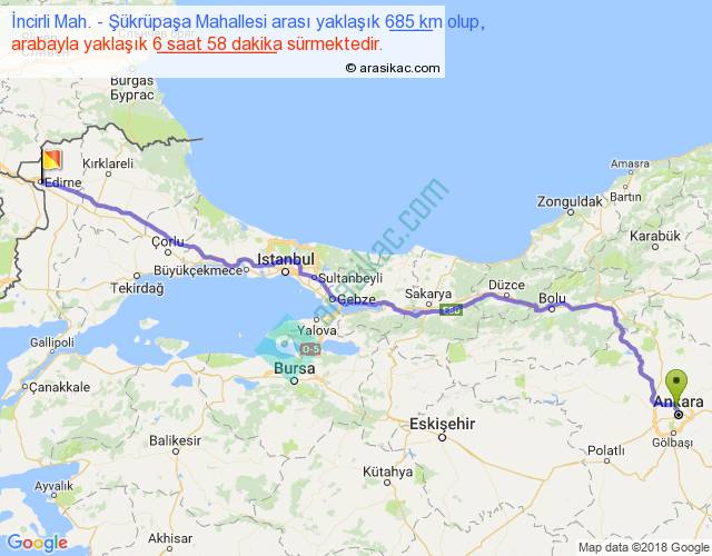 İncirli Mah. - Şükrüpaşa Mahallesi arası yaklaşık olarak 90 km/h ile yukarıda belirtilen sürede olup, iki yerin kuş uçuşu uzaklığı (mesafesi) 556'dir. Eğer belirtilen yerler arasında uçak seferi var ise bu süre uçakla 51 dakika'ya kadar düşebilir. Yolculuk otobüsle 9 saat 3 dakika sürmektedir.