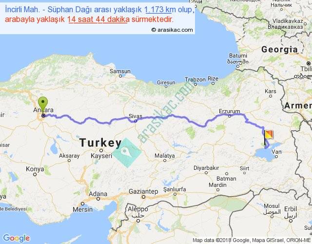 İncirli Mah. - Süphan Dağı arası yaklaşık olarak 90 km/h ile yukarıda belirtilen sürede olup, iki yerin kuş uçuşu uzaklığı (mesafesi) 864'dir. Eğer belirtilen yerler arasında uçak seferi var ise bu süre uçakla 1 saat 19 dakika'ya kadar düşebilir. Yolculuk otobüsle 19 saat 9 dakika sürmektedir.