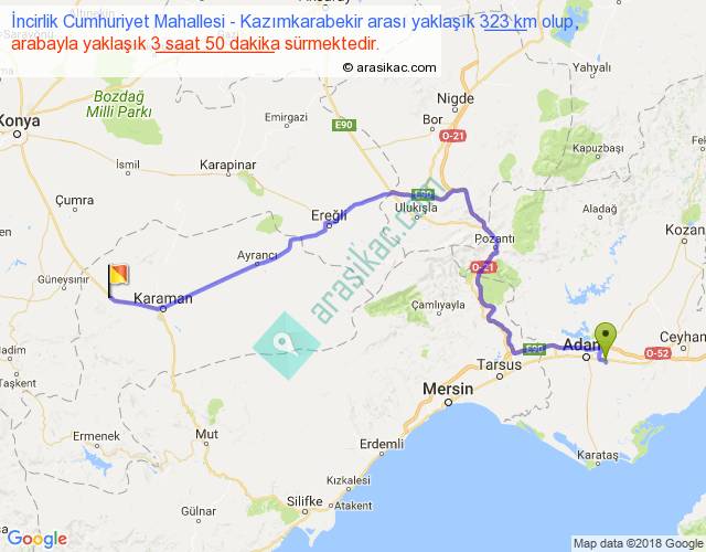 İncirlik Cumhuriyet Mahallesi - Kazımkarabekir arası yaklaşık olarak 90 km/h ile yukarıda belirtilen sürede olup, iki yerin kuş uçuşu uzaklığı (mesafesi) 219'dir. Yolculuk otobüsle 4 saat 59 dakika sürmektedir.
