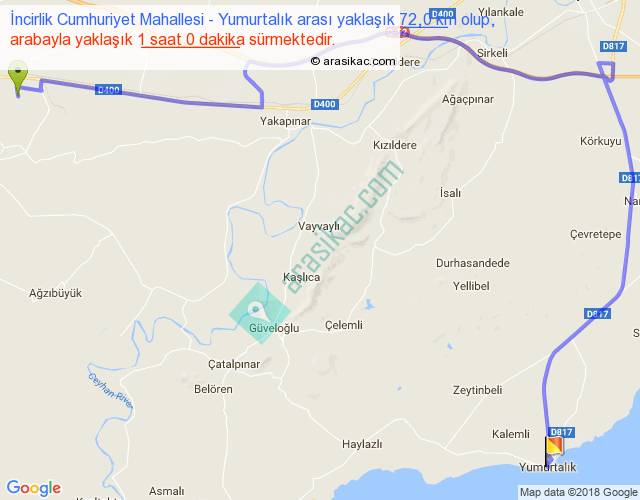 İncirlik Cumhuriyet Mahallesi - Yumurtalık arası yaklaşık olarak 90 km/h ile yukarıda belirtilen sürede olup, iki yerin kuş uçuşu uzaklığı (mesafesi) 39'dir. Yolculuk otobüsle 1 saat 18 dakika sürmektedir.