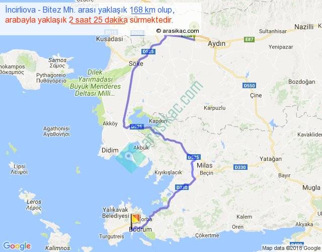 İncirliova - Bitez Mh. arası yaklaşık olarak 90 km/h ile yukarıda belirtilen sürede olup, iki yerin kuş uçuşu uzaklığı (mesafesi) 95'dir. Yolculuk otobüsle 3 saat 8 dakika sürmektedir.
