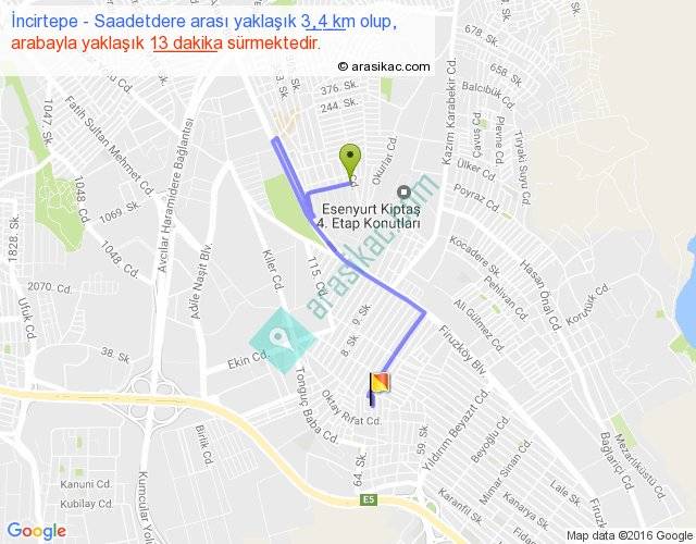 İncirtepe - Saadetdere arası yaklaşık olarak 90 km/h ile yukarıda belirtilen sürede olup, iki yerin kuş uçuşu uzaklığı (mesafesi) 1'dir. Yolculuk otobüsle 16 dakika sürmektedir.