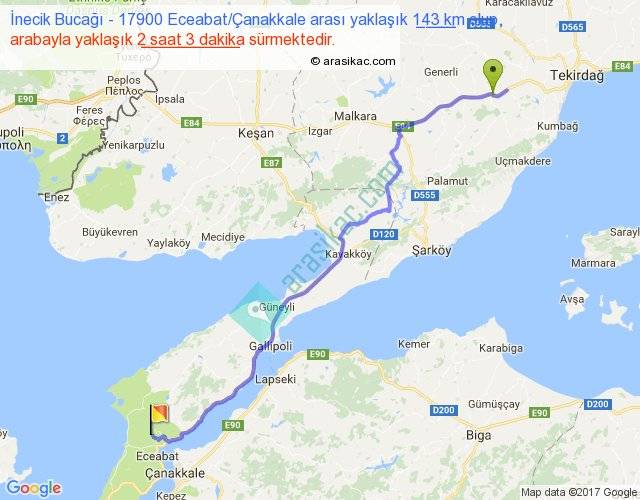İnecik Bucağı - 17900 Eceabat Çanakkale arası yaklaşık olarak 90 km/h ile yukarıda belirtilen sürede olup, iki yerin kuş uçuşu uzaklığı (mesafesi) 111'dir. Yolculuk otobüsle 2 saat 39 dakika sürmektedir.