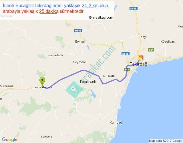 İnecik Bucağı - Tekirdağ arası yaklaşık olarak 90 km/h ile yukarıda belirtilen sürede olup, iki yerin kuş uçuşu uzaklığı (mesafesi) 20'dir. Yolculuk otobüsle 32 dakika sürmektedir.