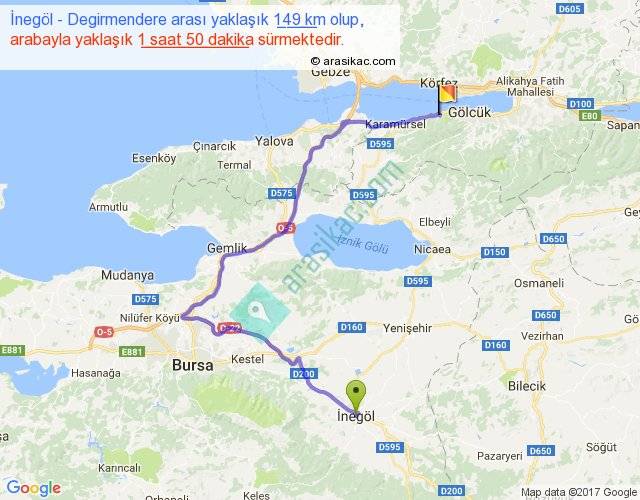 İnegöl - Degirmendere arası yaklaşık olarak 90 km/h ile yukarıda belirtilen sürede olup, iki yerin kuş uçuşu uzaklığı (mesafesi) 72'dir. Yolculuk otobüsle 2 saat 23 dakika sürmektedir.