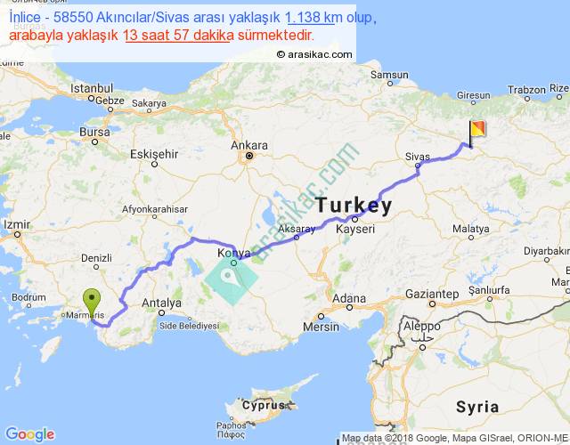 İnlice - 58550 Akıncılar Sivas arası yaklaşık olarak 90 km/h ile yukarıda belirtilen sürede olup, iki yerin kuş uçuşu uzaklığı (mesafesi) 889'dir. Eğer belirtilen yerler arasında uçak seferi var ise bu süre uçakla 1 saat 22 dakika'ya kadar düşebilir. Yolculuk otobüsle 18 saat 8 dakika sürmektedir.