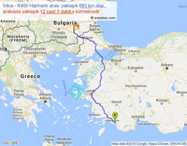 İnlice - 6450 Harmanlı arası yaklaşık olarak 90 km/h ile yukarıda belirtilen sürede olup, iki yerin kuş uçuşu uzaklığı (mesafesi) 631'dir. Eğer belirtilen yerler arasında uçak seferi var ise bu süre uçakla 58 dakika'ya kadar düşebilir. Yolculuk otobüsle 15 saat 39 dakika sürmektedir.