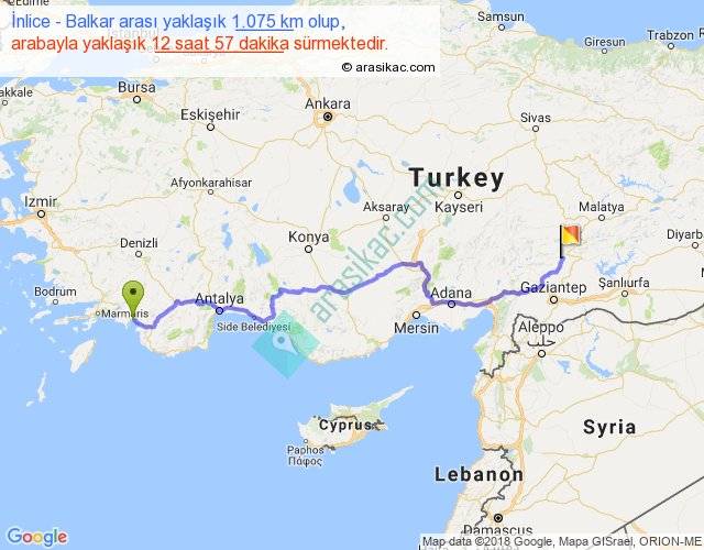İnlice - Balkar arası yaklaşık olarak 90 km/h ile yukarıda belirtilen sürede olup, iki yerin kuş uçuşu uzaklığı (mesafesi) 761'dir. Eğer belirtilen yerler arasında uçak seferi var ise bu süre uçakla 1 saat 10 dakika'ya kadar düşebilir. Yolculuk otobüsle 16 saat 50 dakika sürmektedir.