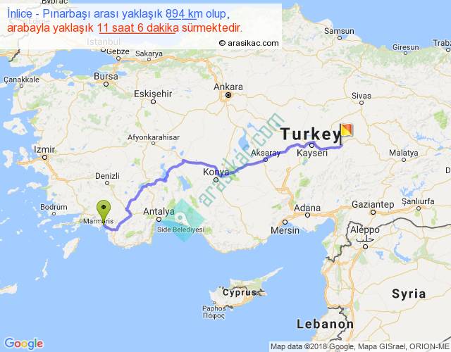 İnlice - Pınarbaşı arası yaklaşık olarak 90 km/h ile yukarıda belirtilen sürede olup, iki yerin kuş uçuşu uzaklığı (mesafesi) 683'dir. Eğer belirtilen yerler arasında uçak seferi var ise bu süre uçakla 1 saat 03 dakika'ya kadar düşebilir. Yolculuk otobüsle 14 saat 25 dakika sürmektedir.