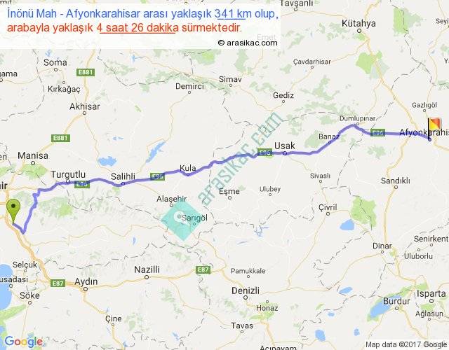 İnönü Mah - Afyonkarahisar arası yaklaşık olarak 90 km/h ile yukarıda belirtilen sürede olup, iki yerin kuş uçuşu uzaklığı (mesafesi) 288'dir. Eğer belirtilen yerler arasında uçak seferi var ise bu süre uçakla 26 dakika'ya kadar düşebilir. Yolculuk otobüsle 5 saat 45 dakika sürmektedir.