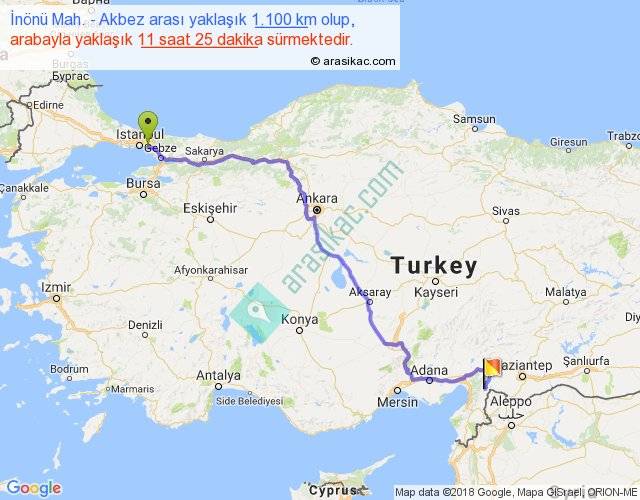 İnönü Mah. - Akbez arası yaklaşık olarak 90 km/h ile yukarıda belirtilen sürede olup, iki yerin kuş uçuşu uzaklığı (mesafesi) 783'dir. Eğer belirtilen yerler arasında uçak seferi var ise bu süre uçakla 1 saat 12 dakika'ya kadar düşebilir. Yolculuk otobüsle 14 saat 50 dakika sürmektedir.