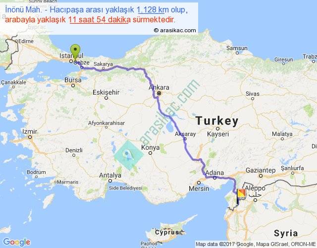 İnönü Mah. - Hacıpaşa arası yaklaşık olarak 90 km/h ile yukarıda belirtilen sürede olup, iki yerin kuş uçuşu uzaklığı (mesafesi) 827'dir. Eğer belirtilen yerler arasında uçak seferi var ise bu süre uçakla 1 saat 16 dakika'ya kadar düşebilir. Yolculuk otobüsle 15 saat 28 dakika sürmektedir.