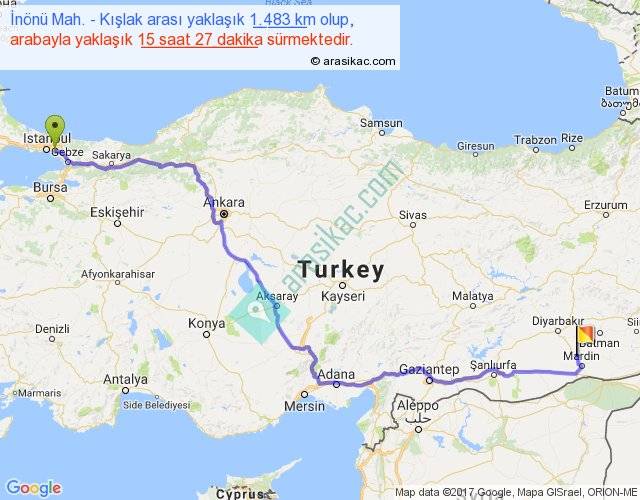 İnönü Mah. - Kışlak arası yaklaşık olarak 90 km/h ile yukarıda belirtilen sürede olup, iki yerin kuş uçuşu uzaklığı (mesafesi) 1055'dir. Eğer belirtilen yerler arasında uçak seferi var ise bu süre uçakla 1 saat 37 dakika'ya kadar düşebilir. Yolculuk otobüsle 20 saat 5 dakika sürmektedir.
