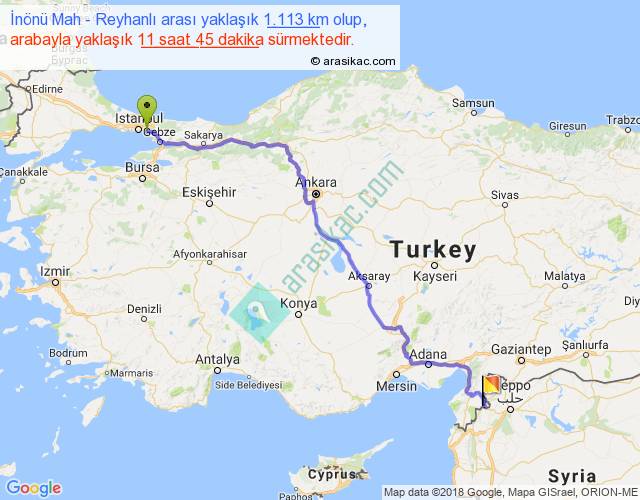 İnönü Mah - Reyhanlı arası yaklaşık olarak 90 km/h ile yukarıda belirtilen sürede olup, iki yerin kuş uçuşu uzaklığı (mesafesi) 825'dir. Eğer belirtilen yerler arasında uçak seferi var ise bu süre uçakla 1 saat 16 dakika'ya kadar düşebilir. Yolculuk otobüsle 15 saat 16 dakika sürmektedir.
