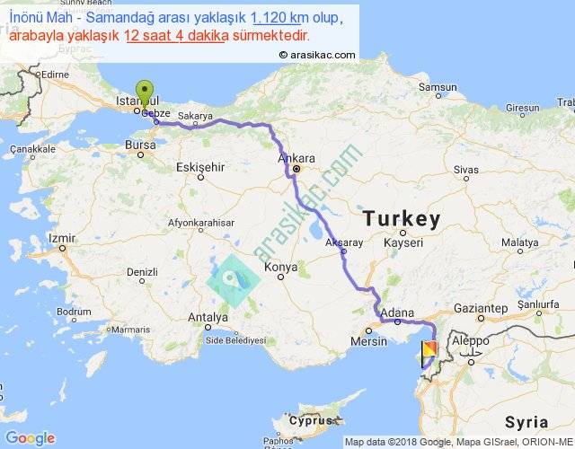İnönü Mah - Samandağ arası yaklaşık olarak 90 km/h ile yukarıda belirtilen sürede olup, iki yerin kuş uçuşu uzaklığı (mesafesi) 799'dir. Eğer belirtilen yerler arasında uçak seferi var ise bu süre uçakla 1 saat 13 dakika'ya kadar düşebilir. Yolculuk otobüsle 15 saat 41 dakika sürmektedir.