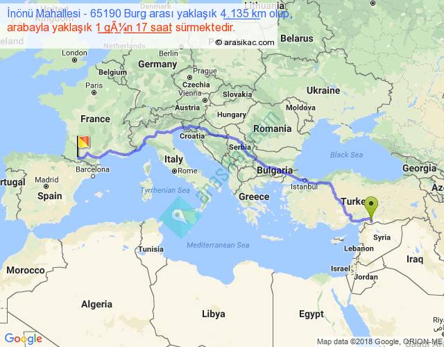 İnönü Mahallesi - 65190 Burg arası yaklaşık olarak 90 km/h ile yukarıda belirtilen sürede olup, iki yerin kuş uçuşu uzaklığı (mesafesi) 3186'dir. Eğer belirtilen yerler arasında uçak seferi var ise bu süre uçakla 4 saat 54 dakika'ya kadar düşebilir. Yolculuk otobüsle 2 gün 5 saat sürmektedir.