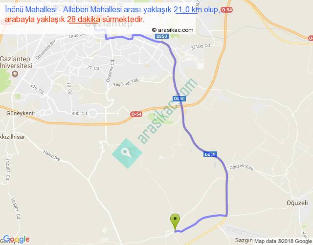 İnönü Mahallesi - Alleben Mahallesi arası yaklaşık olarak 90 km/h ile yukarıda belirtilen sürede olup, iki yerin kuş uçuşu uzaklığı (mesafesi) 13'dir. Yolculuk otobüsle 36 dakika sürmektedir.