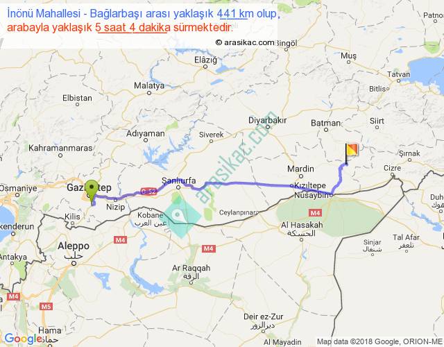 İnönü Mahallesi - Bağlarbaşı arası yaklaşık olarak 90 km/h ile yukarıda belirtilen sürede olup, iki yerin kuş uçuşu uzaklığı (mesafesi) 359'dir. Eğer belirtilen yerler arasında uçak seferi var ise bu süre uçakla 33 dakika'ya kadar düşebilir. Yolculuk otobüsle 6 saat 35 dakika sürmektedir.