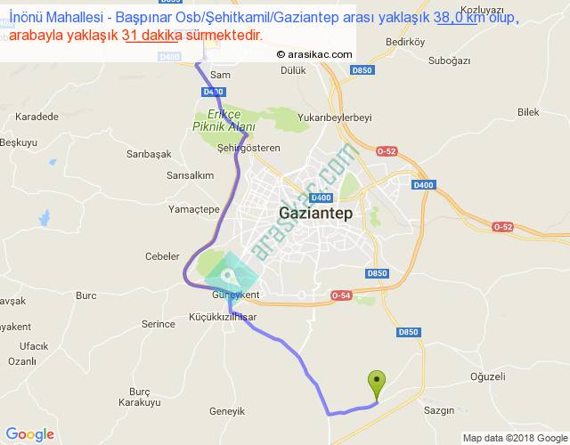 İnönü Mahallesi - Başpınar Osb Şehitkamil Gaziantep arası yaklaşık olarak 90 km/h ile yukarıda belirtilen sürede olup, iki yerin kuş uçuşu uzaklığı (mesafesi) 26'dir. Yolculuk otobüsle 40 dakika sürmektedir.