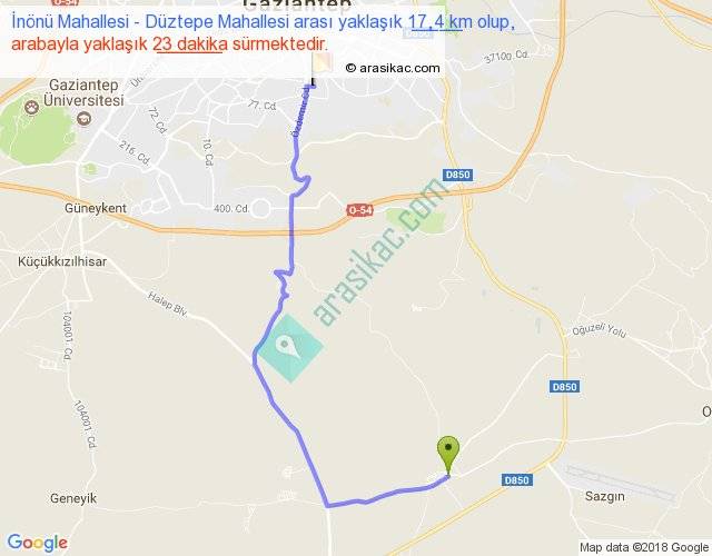 İnönü Mahallesi - Düztepe Mahallesi arası yaklaşık olarak 90 km/h ile yukarıda belirtilen sürede olup, iki yerin kuş uçuşu uzaklığı (mesafesi) 11'dir. Yolculuk otobüsle 29 dakika sürmektedir.