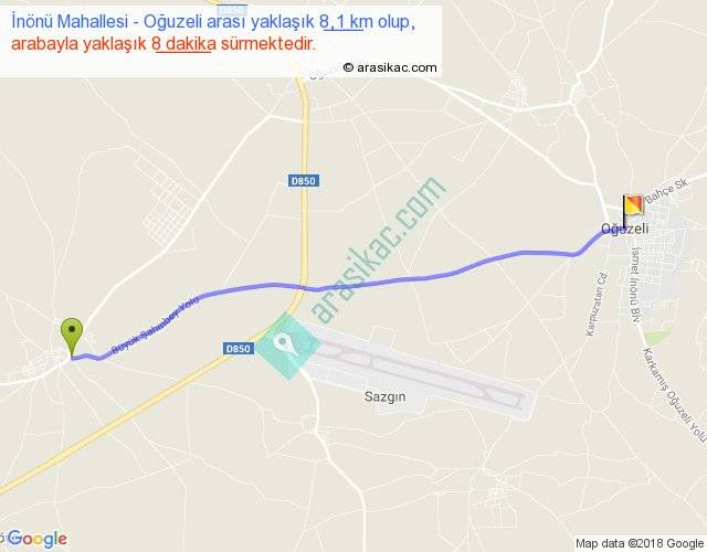 İnönü Mahallesi - Oğuzeli arası yaklaşık olarak 90 km/h ile yukarıda belirtilen sürede olup, iki yerin kuş uçuşu uzaklığı (mesafesi) 8'dir. Yolculuk otobüsle 10 dakika sürmektedir.