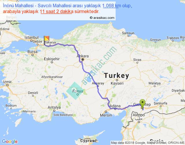 İnönü Mahallesi - Savcılı Mahallesi arası yaklaşık olarak 90 km/h ile yukarıda belirtilen sürede olup, iki yerin kuş uçuşu uzaklığı (mesafesi) 767'dir. Eğer belirtilen yerler arasında uçak seferi var ise bu süre uçakla 1 saat 10 dakika'ya kadar düşebilir. Yolculuk otobüsle 14 saat 20 dakika sürmektedir.