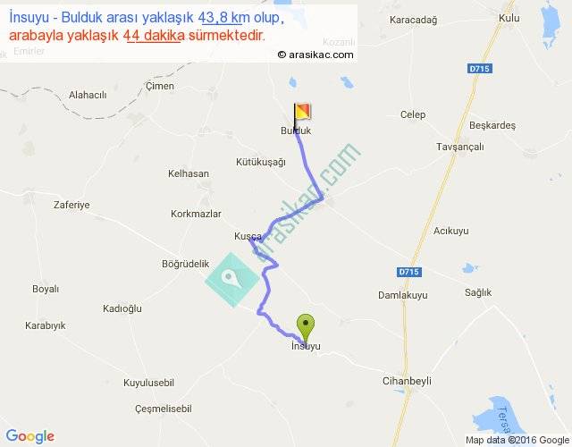 İnsuyu - Bulduk arası yaklaşık olarak 90 km/h ile yukarıda belirtilen sürede olup, iki yerin kuş uçuşu uzaklığı (mesafesi) 29'dir. Yolculuk otobüsle 57 dakika sürmektedir.